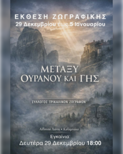 Ο Δήμος Μετεώρων καλεί τους δημότες και τους επισκέπτες της περιοχής να τιμήσουν με την παρουσία τους την ομαδική έκθεση ζωγραφικής του Συλλόγου Τρικαλινών Ζωγράφων με τίτλο «Μεταξύ Ουρανού και Γης», η οποία τελεί υπό την αιγίδα του Δήμου Μετεώρων και φιλοξενείται στην Αίθουσα «Νίτσα Λιάπη» στην Καλαμπάκα.