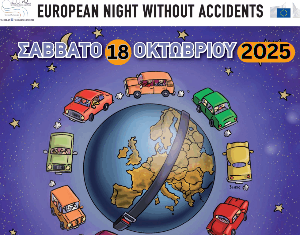 Το Ινστιτούτο Οδικής Ασφάλειας (Ι.Ο.ΑΣ.) «Πάνος Μυλωνάς» και ο Δήμος Τρικκαίων διοργανώνουν και φέτος τη μεγάλη πανελλαδική δράση ευαισθητοποίησης «Ευρωπαϊκή Νύχτα χωρίς Ατυχήματα». Η δράση θα πραγματοποιηθεί το Σάββατο 18 Οκτωβρίου 2025 και σε δεκάδες πόλεις σε όλη την Ελλάδα, με τη συμμετοχή εκατοντάδων εθελοντών του Δικτύου του.