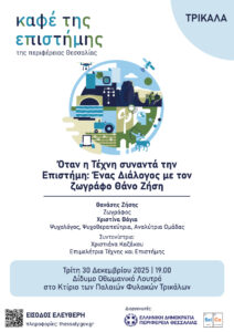 Με μια ξεχωριστή εκδήλωση που φέρνει σε δημιουργική συνομιλία την τέχνη και την επιστήμη, ρίχνει αυλαία για το 2025 το «Καφέ της Επιστήμης της Περιφέρειας Θεσσαλίας» στα Τρίκαλα, ολοκληρώνοντας τον φετινό κύκλο ανοιχτών συναντήσεων με το κοινό.