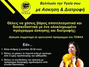 Ερευνητικό πρόγραμμα για τη σχέση άσκησης και διατροφής ως προς τη μείωση του βάρους και τη βελτίωση της υγείας, υλοποιεί το ΤΕΦΑΑ της ΣΕΦΑΑΔ του Πανεπιστημίου Θεσσαλίας, με τη στήριξη του Δήμου Τρικκαίων.