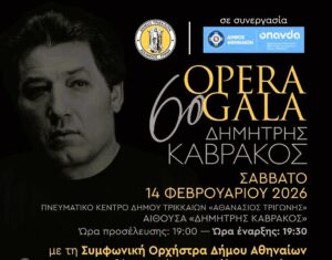 Tο 6ο Opera Gala «Δημήτρης Καβράκος» διοργανώνεται από τον Δήμο Τρικκαίων σε συνεργασία με τον Οργανισμό Πολιτισμού, Αθλητισμού και Νεολαίας Δήμου Αθηναίων (ΟΠΑΝΔΑ). Θα πραγματοποιηθεί το Σάββατο 14 Φεβρουαρίου 2026, στις 7.30 το απόγευμα, στην κεντρική αίθουσα του Πνευματικού Κέντρου Δήμου Τρικκαίων «Αθανάσιος Τριγώνης», η οποία φέρει το όνομα «Δημήτρης Καβράκος».