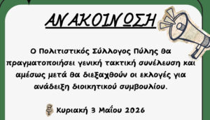 Γενική τακτική συνέλευση Πολιτιστικού Συλλόγου Πύλης, θα πραγματοποιηθεί την Κυριακή 3/5/2026, ώρα 11:30-13:30, στο Πολιτιστικό Κέντρο Δήμου Πύλης.