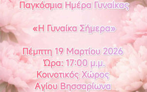 Το Κέντρο Κοινότητας Δήμου Πύλης σε συνεργασία με το Συμβουλευτικό Κέντρο Γυναικών Δήμου Τρικκαίων, με αφορμή την Παγκόσμια Ημέρα Γυναίκας, σας προσκαλούν σε ενημερωτική εκδήλωση, με θέμα: «Η Γυναίκα Σήμερα», την Πέμπτη 19 Μαρτίου 2026, ώρα 17:00 μ.μ., στο Κοινοτικό Κατάστημα του Αγίου Βησσαρίωνα Δ. Πύλης.