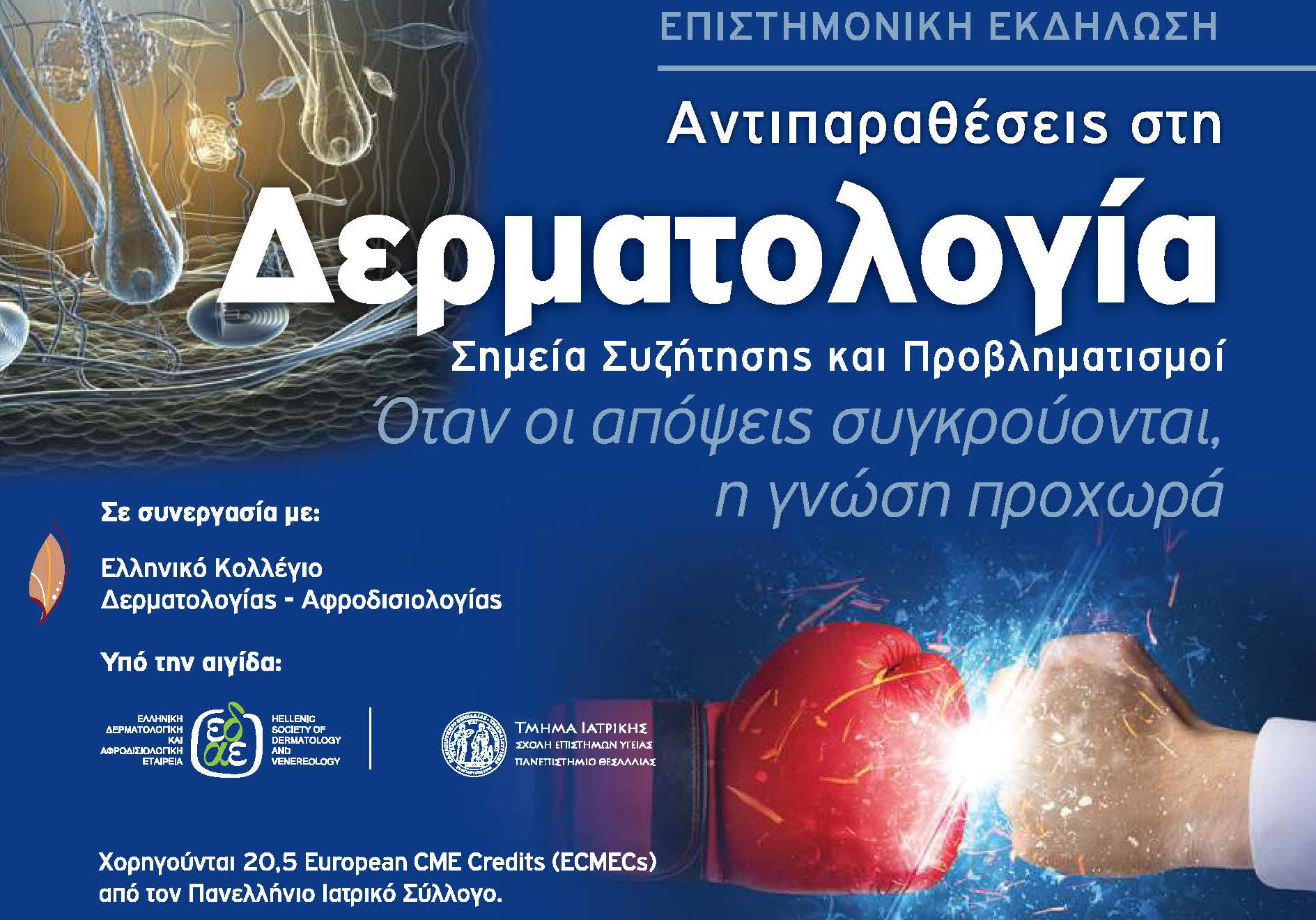 Η εκδήλωση πραγματοποιείται σε συνεργασία με το Ελληνικό Κολλέγιο Δερματολογίας – Αφροδισιολογίας και την 5ηΥγειονομική Περιφέρεια Θεσσαλίας και Στερεάς Ελλάδας, υπό την αιγίδα της Ελληνικής Δερματολογικής και Αφροδισιολογικής Εταιρείας (ΕΔΑΕ) και του Τμήματος Ιατρικής του Πανεπιστημίου Θεσσαλίας.