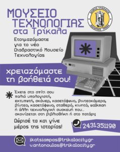 Το νέο Διαδραστικό Μουσείο Τεχνολογίας στα Τρίκαλα ετοιμάζεται και ο Δήμος Τρικκαίων απευθύνεται στους πολίτες που θέλουν να συμβάλουν στη δημιουργία του. Στον χώρο της πρώην ΤΑΞΥΠ θα εκτεθούν αντικείμενα από όλο το φάσμα της τεχνολογικής εξέλιξης και σε όλα τα επίπεδα. Για τον λόγο αυτόν, ο Δήμος Τρικκαίων απευθύνει ανοιχτή πρόσκληση σε όλους/ες τους/τις συμπολίτες/ισσες και φίλους/ες της τεχνολογίας, να συμβάλουν στη δημιουργία μιας ξεχωριστής συλλογής, προσφέροντας παλαιά τεχνολογικά μέσα. Αυτά τα αντικείμενα, αφού αξιολογηθούν από ειδική ομάδα του έργου, θα εκτεθούν στο υπό δημιουργία Μουσείο.