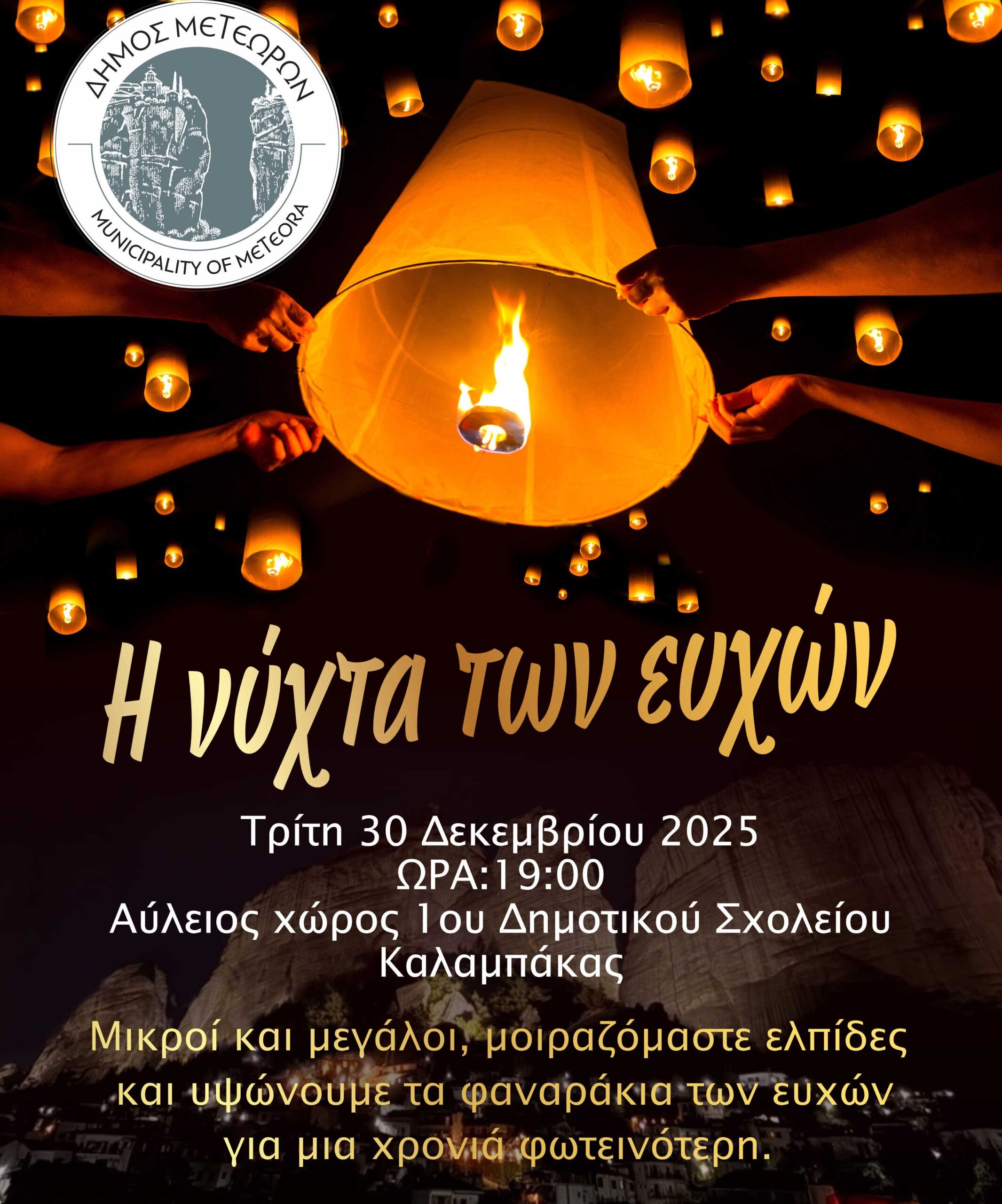 Ο Δήμος Μετεώρων προσκαλεί μικρούς και μεγάλους σε μια ξεχωριστή, συμβολική εκδήλωση γεμάτη φως, συναίσθημα και ελπίδα, με τίτλο «Η Νύχτα των Ευχών», την Τρίτη 30 Δεκεμβρίου 2025, στις 19:00, στον αύλειο χώρο του 1ου Δημοτικού Σχολείου Καλαμπάκας.