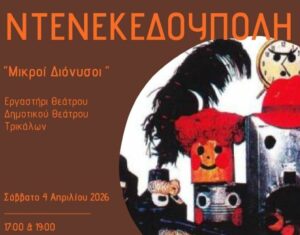 Οι «Μικροί Διόνυσοι» του Εργαστηρίου Θεάτρου του Δημοτικού Θεάτρου Τρικάλων παρουσιάζουν την παράσταση «Ντενεκεδούπολη» της Ευγενίας Φακίνου το Σάββατο 4 Απριλίου στις 17.00 και στις 19.00 στον Δημοτικό Κινηματογράφο, στον Μύλο Ματσόπουλου.