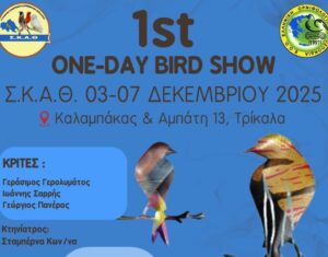 Μια ακόμη σημαντική διοργάνωση για τον Σύλλογο Καναρινιών και Αγριοπουλιών Θεσσαλίας (ΣΚΑΘ) πραγματοποιείται στα Τρίκαλα. Το πενθήμερο 3 έως 7 Δεκεμβρίου 2025 ο ΣΚΑΘ διοργανώνει τον Πρώτο Μονοήμερο Διαγωνισμό Πουλιών (1st One-day Bird Show), στον χώρο δίπλα από το Στ΄ ΚΑΠΗ (Καλαμπάκας και Αμπάτη 13).