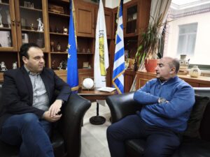 Τον Υπουργό Ψηφιακής Διακυβέρνησης Δημήτρη Παπαστεργίου υποδέχθηκε παραμονή Πρωτοχρονιάς ο Δήμαρχος Τρικκαίων και πρόεδρος της ΠΕΔ Θεσσαλίας, Νίκος Σακκάς. το πρωί της 31ης Δεκεμβρίου 2025 ο κ. Παπαστεργίου επισκέφθηκε το Δημαρχείο Τρικκαίων, συνομιλώντας με το κ. Σακκά για τρέχοντα ζητήματα και ανταλλάσσοντας ευχές για τη νέα, δημιουργική χρονιά για τον Δήμο και τους δημότες.