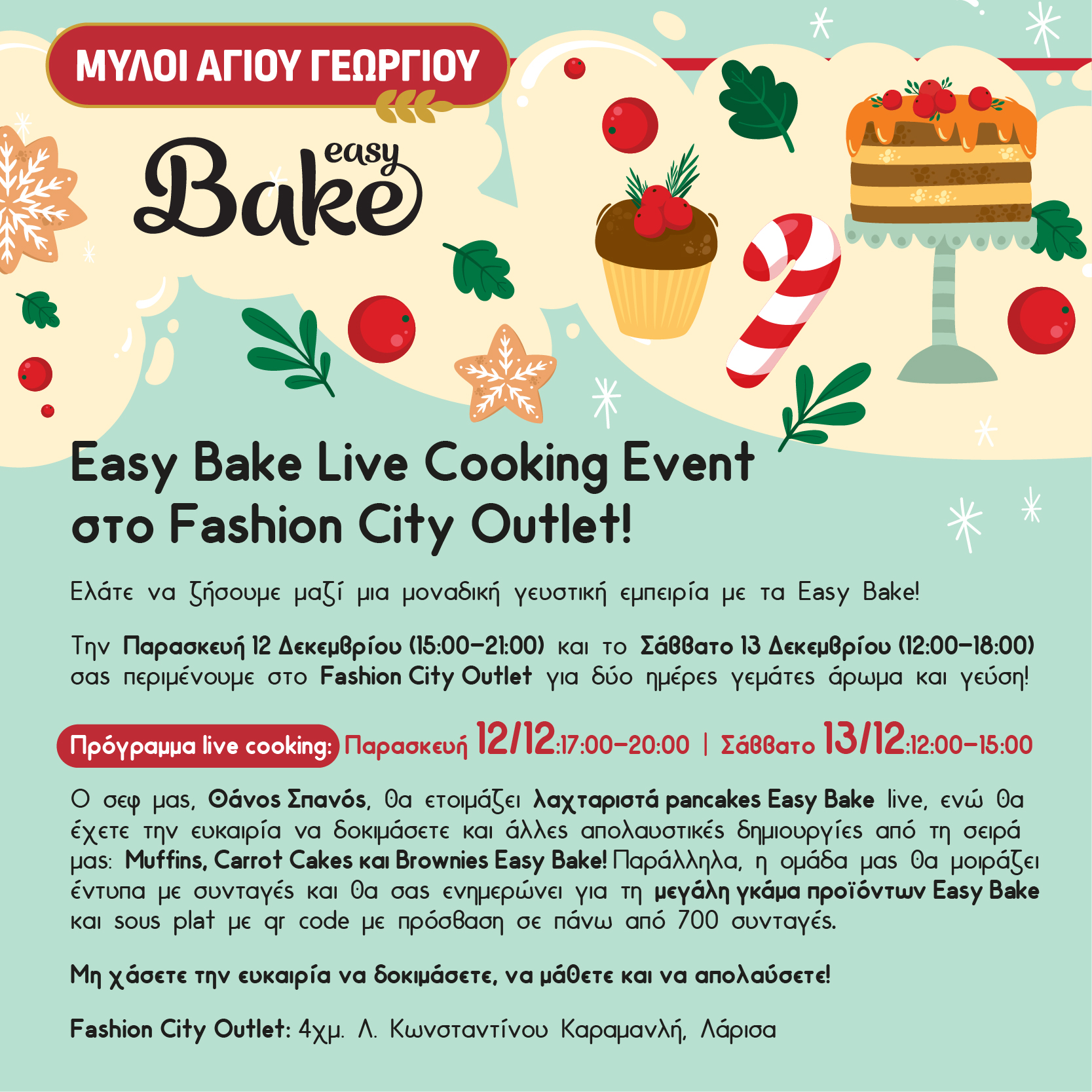 Την Παρασκευή 12 Δεκεμβρίου (17:00–20:00) και το Σάββατο 13 Δεκεμβρίου (12:00–15:00), οι μικροί μας φίλοι μπαίνουν στην πιο νόστιμη χριστουγεννιάτικη δράση με το Easy Bake Live Cooking. Ο σεφ του Easy Bake από τους Μύλους Αγ. Γεωργίου ετοιμάζει λαχταριστά pancakes επί σκηνής, τα παιδιά δοκιμάζουν γλυκές δημιουργίες Easy Bake και παίρνουν μαζί τους ιδέες και έντυπα με συνταγές που μπορούν να απολαύσουν στο σπίτι με όλη την οικογένεια.