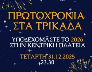 Η πρωτεύουσα των Χριστουγέννων υποδέχεται το 2026 και καλεί κάθε έναν και κάθε μία για μια ξεχωριστή γιορτή! Από τις 23.30 το βράδυ της 31ης Δεκεμβρίου 2025, τρικαλινοί/ες και επισκέπτες/τριες συγκεντρώνονται στην κεντρική πλατεία Ηρώων Πολυτεχνείου των Τρικάλων για να υποδεχθούμε με λαμπρότητα το νέο έτος 2026. Με μουσική από τους Teasers, κοπή πίτας και πλούσια δώρα, η γιορτή ξεκινά από τα Τρίκαλα για ένα όμορφο και ευτυχισμένο 2026!