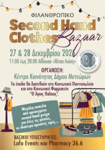 Το Κέντρο Κοινότητας Δήμου Μετεώρων διοργανώνει ένα Φιλανθρωπικό Second Hand Clothes Bazaar, το οποίο θα πραγματοποιηθεί τo Σάββατο 27 και την Κυριακή 28 Δεκεμβρίου 2025, από 11:00 το πρωί έως τις 20:00 το βράδυ, στην Αίθουσα «Νίτσα Λιάπη».