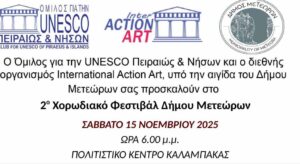 Ο Όμιλος για την UNESCO Πειραιώς & Νήσων και ο διεθνής οργανισμός International Action Art, υπό την αιγίδα του Δήμου Μετεώρων, διοργανώνουν το 2 ο Χορωδιακό Φεστιβάλ Δήμου Μετεώρων, το Σάββατο 15 Νοεμβρίου 2025 και ώρα 6:00 μ.μ., στο Πολιτιστικό Κέντρο Καλαμπάκας.