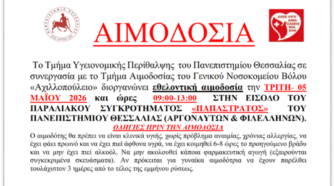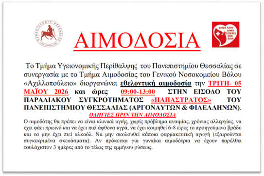Το Τμήμα Περίθαλψης και Κοινωνικής Μέριμνας του Πανεπιστημίου Θεσσαλίας, σε συνεργασία με το Τμήμα Αιμοδοσίας του Πανεπιστημιακού Γενικού Νοσοκομείου Λάρισας, διοργανώνει εθελοντική αιμοδοσία την Τετάρτη 29 και την Πέμπτη 30 Απριλίου 2026, από τις 10:00 έως τις 14:00, στον κεντρικό διάδρομο του Κεντρικού Κτηρίου του συγκροτήματος «ΓΑΙΟΠΟΛΙΣ» του Πανεπιστημίου Θεσσαλίας, πίσω από τη στάση του …