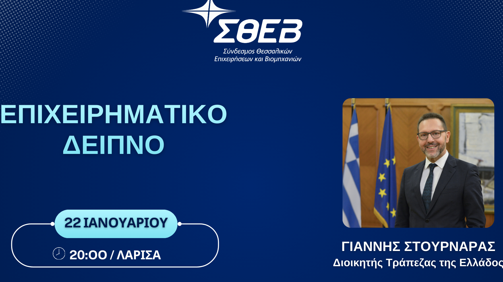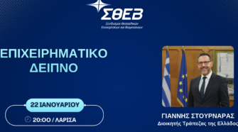 Ο Σύνδεσμος Θεσσαλικών Επιχειρήσεων και Βιομηχανιών διοργανώνει το καθιερωμένο ετήσιο επιχειρηματικό δείπνο για τα μέλη του, την Πέμπτη 22 Ιανουαρίου και ώρα 20:00, στο ξενοδοχείο «Grecotel Larissa Imperial», στη Λάρισα. Κεντρικός ομιλητής θα είναι ο Διοικητής της Τράπεζας της Ελλάδος, κ. Γιάννης Στουρνάρας.Η συζήτηση αναμένεται να καλύψει σημαντικά ζητήματα όπως η θέση της ελληνικής οικονομίαςστην …