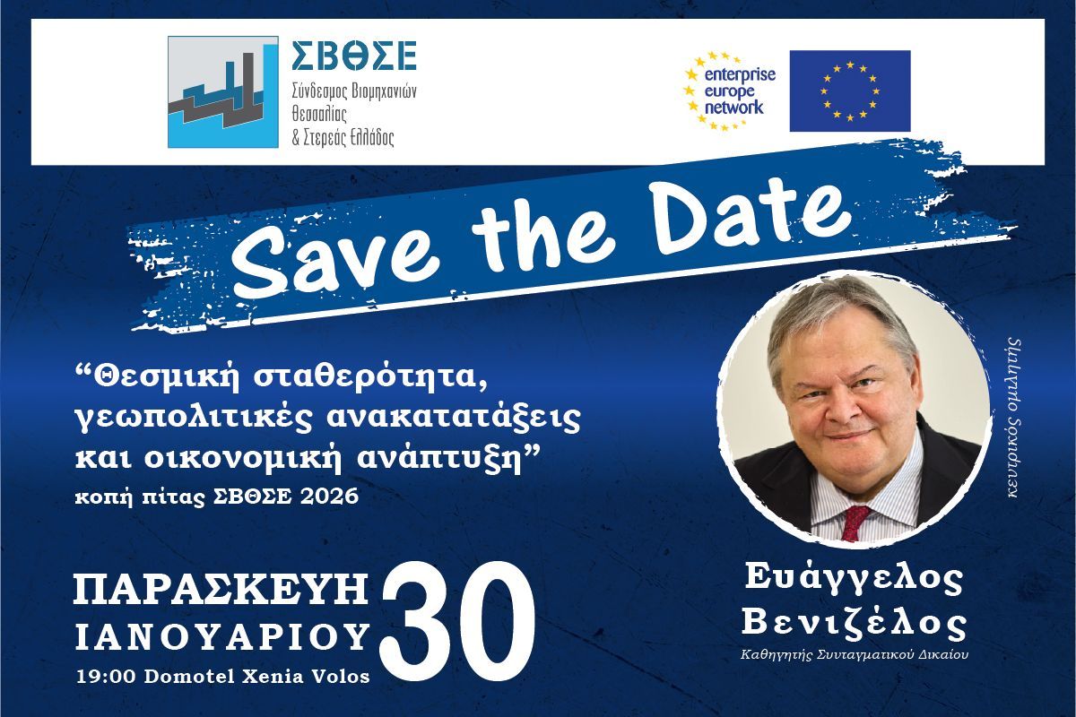 Ένα ηχηρό όνομα της πολιτικής και ακαδημαϊκής ζωής της χώρας θα δώσει το παρόν στην πρώτη μεγάλη εκδήλωση του Συνδέσμου Βιομηχανιών Θεσσαλίας & Στερεάς Ελλάδος (ΣΒΘΣΕ) για το 2026. Ο Σύνδεσμος φιλοξενεί ως Κεντρικό Ομιλητή τον τ. Αντιπρόεδρο της Κυβέρνησης και Καθηγητή Συνταγματικού Δικαίου κ. Ευάγγελο Βενιζέλο, στο πλαίσιο θεματικής εκδήλωσης με τίτλο: «Θεσμική Σταθερότητα, Γεωπολιτικές Ανακατατάξεις και Οικονομική Ανάπτυξη». Η …